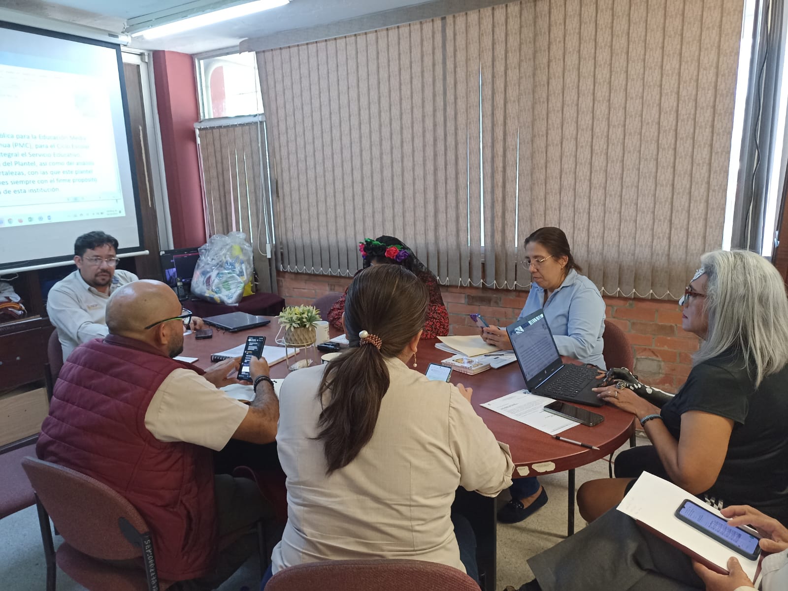 El director Edgar Ponce Santiago y la Subdirectora Ingrid García Gómez, llevaron a cabo una reunión con los jefes de Departamento: Nadia Elizabeth Huerta mariscal jefa de Servicios Administrativos de ambos turnos, Lucia Molina Ruiz jefa de Planeación y Evaluación Ambos turnos, José Guadalupe Córdoba Torres jefe de Vinculación con el Sector Productivo ambos turnos, Luis Lara Bravo jefe de servicios Escolares turno matutino, Rosa Iris Vergara Rios jefa de Servicios Escolares turno vespertino, Diana Zayas Manjarrez jefa de Docentes turno matutino y Rosa Carmen Valdes Sánchez jefa de Docentes turno vespertino, con el objetivo de tomar acuerdos para la elaboración del Plan de Mejora Continua del plantel.