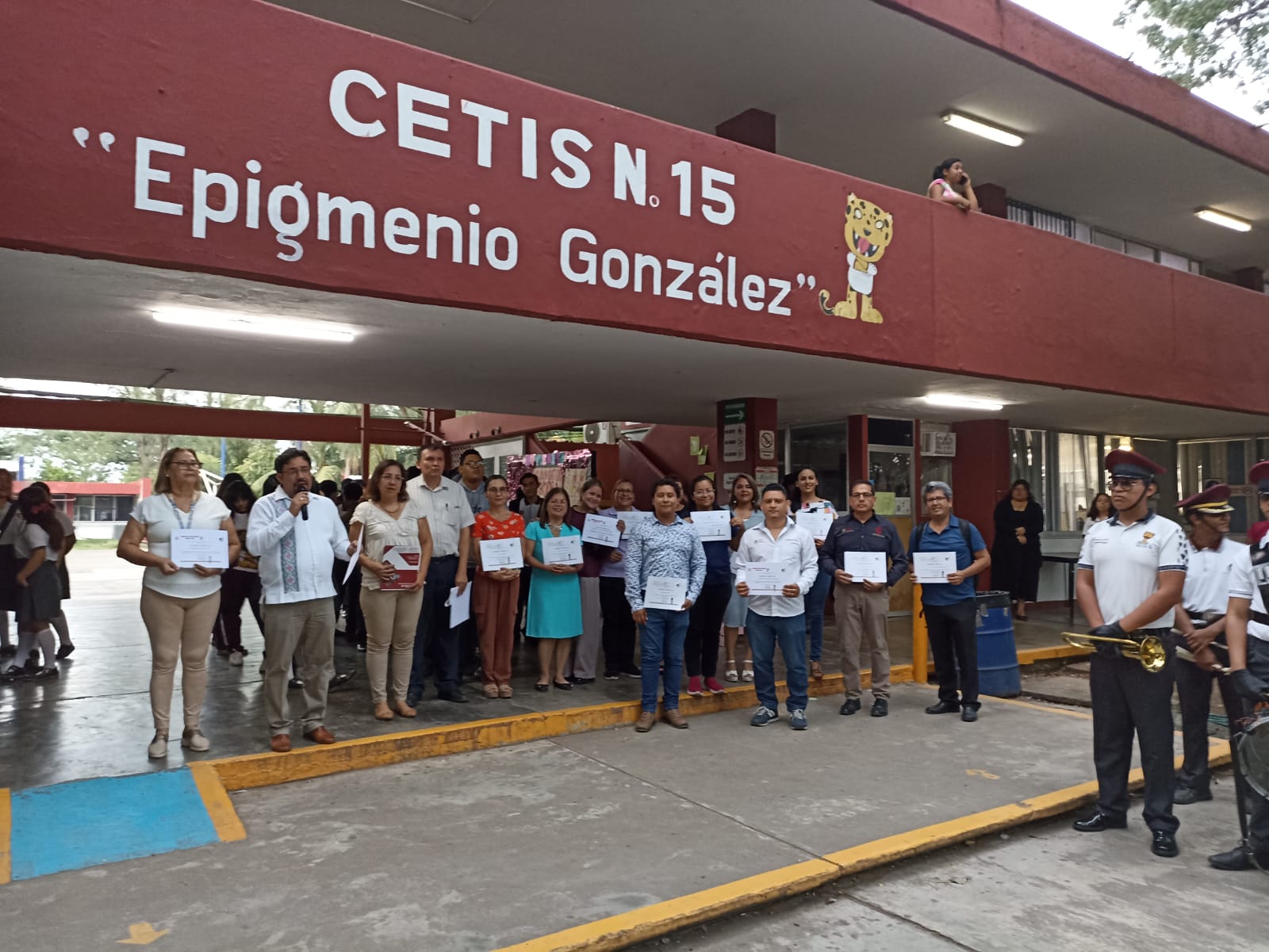 Se llevó a cabo el Homenaje a la Bandera turno vespertino a cargo del grupo de 3BELV asesorados por el tutor Everardo Guijarro Mora, estuvieron presentes el Director del plantel Edgar Ponce Santiago, Rosa Carmen Valdes Sánchez Jefa de Docentes T/V y Rosa Iris Vergara Rios jefa de Servicios Escolares T/V, quienes hicieron entrega de Constancias a los grupos de los primeros, terceros y quintos semestres, por su participación en el festival de día de muertos del CETis No. 15 con la elaboración de un Tifo grupal, también por la caracterización grupal, se les dio un reconocimiento a los maestros que participaron como tutores en dicho Festival. De igual manera se les otorgó una constancia de reconocimiento a los Docentes por su participación en la elaboración de reactivos de acuerdo a las diferentes asignaturas con las que participaron en el XXIV Festival Académico etapa Local. Muchas Felicidades a todos los docentes y alumnos por su gran contribución y por formar parte de este equipo de trabajo que cada día crece en entusiasmo y colaboración.