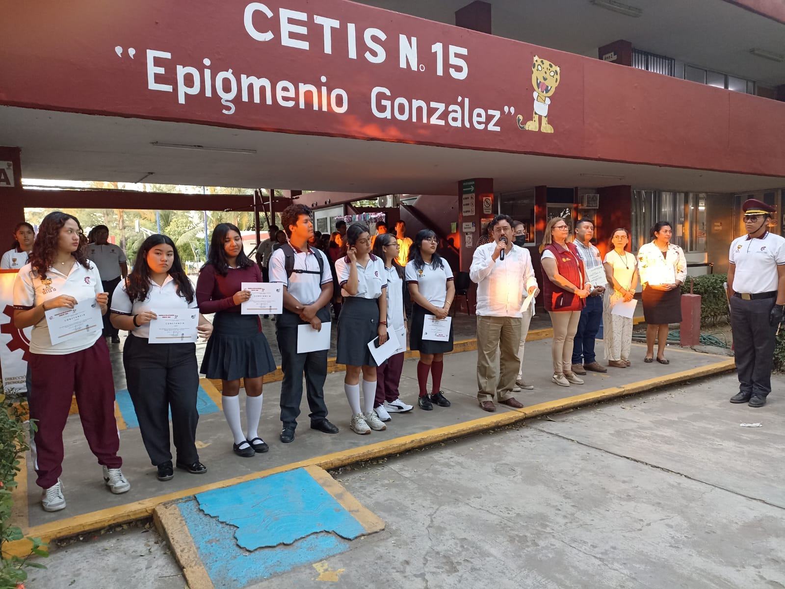Se llevó a cabo el homenaje a la bandera turno vespertino a cargo del grupo de 3APRV asesorados por la maestra Ana Paula Aldama Uribe, Edgar Ponce Santiago director del plantel, Rosa Carmen Valdes Sánchez Jefa de Docentes T/V y Rosa Iris Vergara Rios jefa de Servicios Escolares T/V, hicieron entrega de constancias de reconocimiento a tutores Académicos y a alumnos de quinto semestre por su participación grupal en la ofrenda del Día de Muertos, también se les entrego Constancia de participación a los docentes Asesores en El XXIV Festival Académico 2025 en la Etapa Zona, en las diferentes disciplinas ganadoras, ya que el CETis No.15 se viste de gala porque se obtuvieron 4 primeros Lugares, Felicidades a todos deseando sigan los logros.
