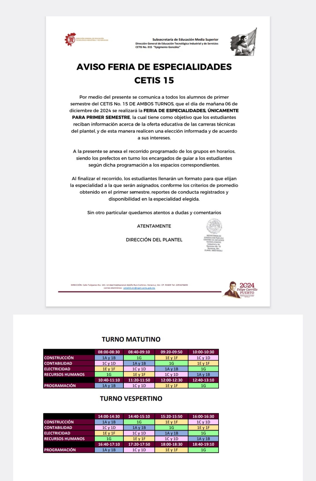 FERIA DE ESPECIALIDADES PARA LOS JOVENES DE PRIMER SEMESTRE, AMBOS TURNOS