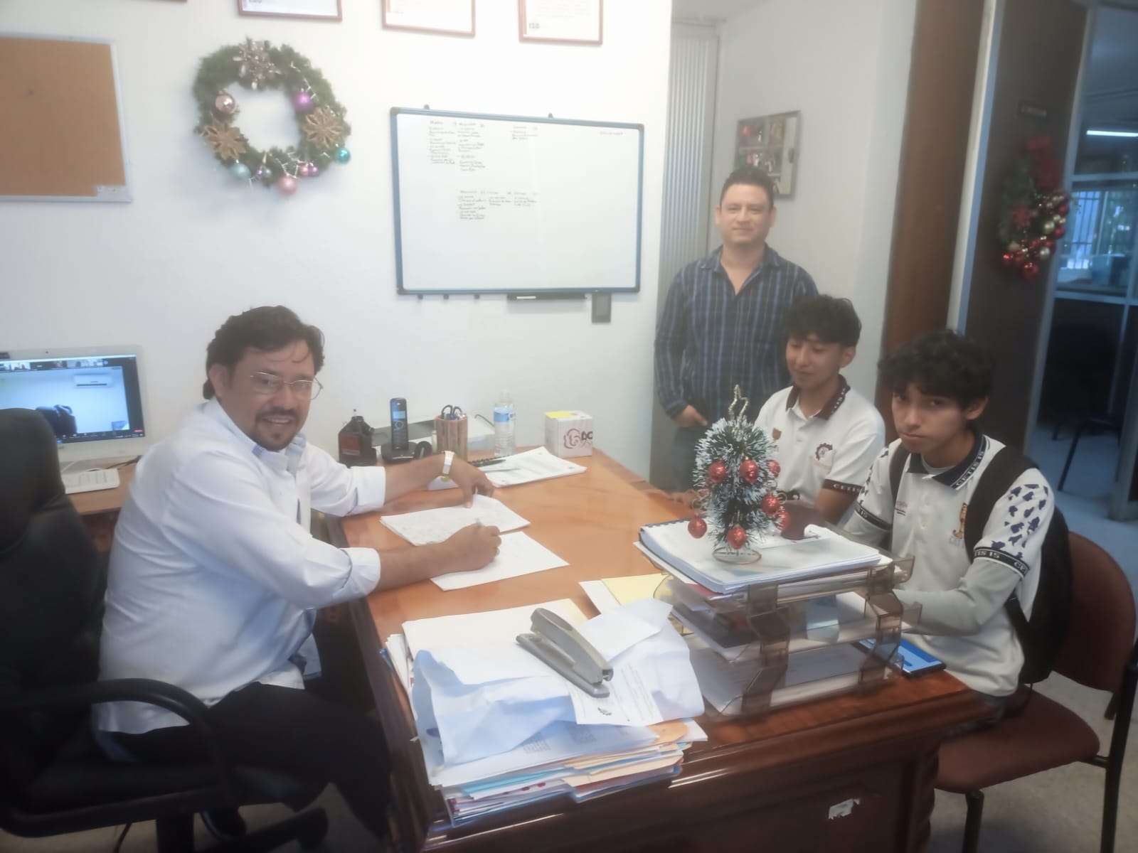 Platica con el Director, acerca de un prototipo escolar, desarrollado por los alumnos Bryan Gael Hernández, Francisco Lara y Caleb Rosales del 5APRV de la especialidad de programación. Asesorados por el Lic. Canek R. Regalado Herrera y la Dra. Belem Alejandra Contreras Rodríguez.