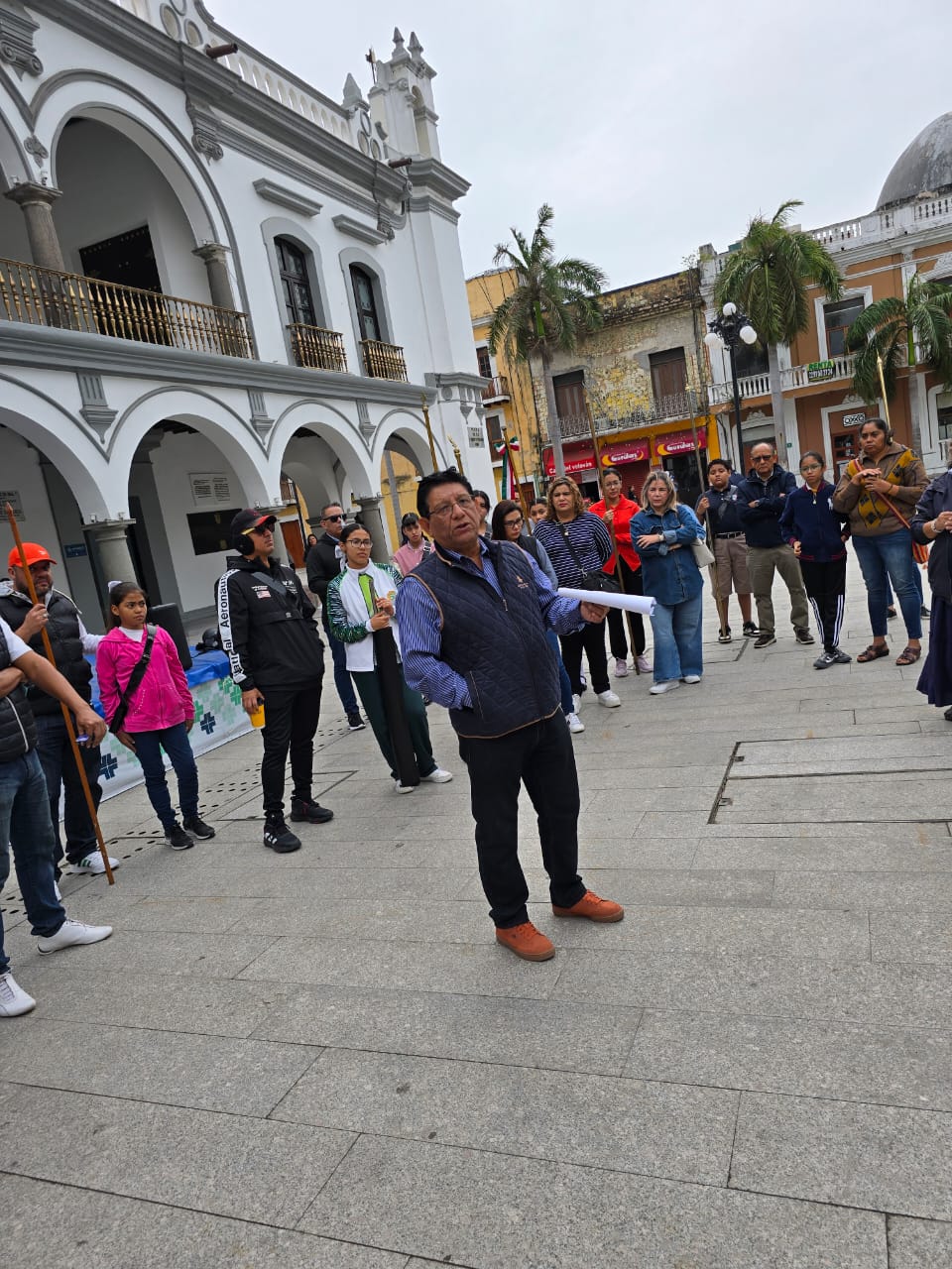 La docente jefa de servicio escolares del T/V Rosa Iris Vergara Rios, en compañía de alumnas de la escolta del turno vespertino, asisten al segundo ensayo del evento "Abanderamiento de Escuela" que organiza el H. Ayuntamiento de Veracruz, a través de la Dirección de Educación.