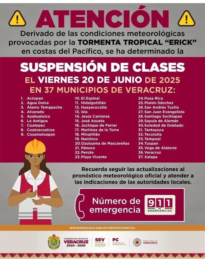 Derivado de las condiciones meteorológicas en el estado de Veracruz ocasionadas por la Tormenta Tropical Erick en costas del Pacífico”, este viernes 20 de junio se suspenden clases y labores escolares en 37 municipios del estado de Veracruz.
