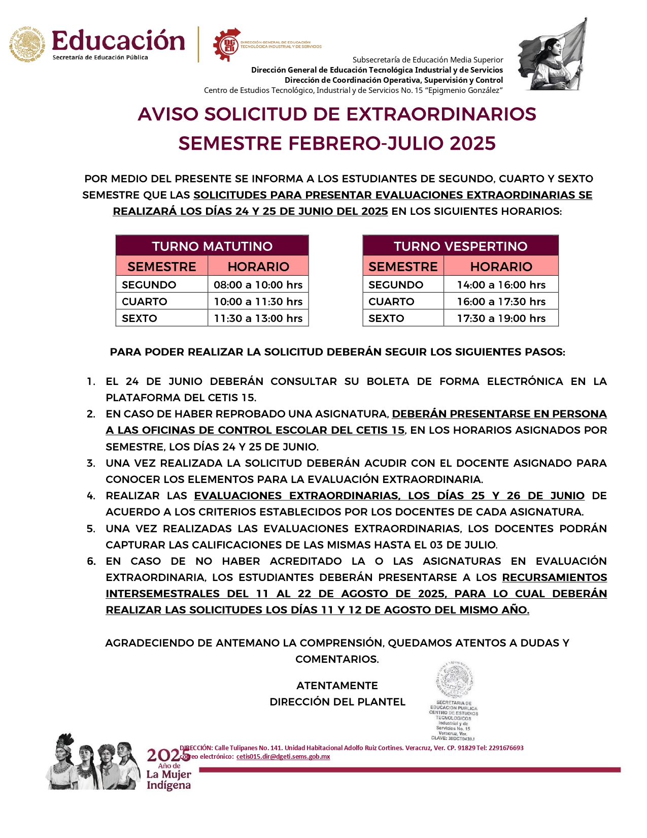 2. EN CASO DE HABER REPROBADO UNA ASIGNATURA, DEBERÁN PRESENTARSE EN PERSONA A LAS OFICINAS DE CONTROL ESCOLAR DEL CETIS 15, EN LOS HORARIOS ASIGNADOS POR SEMESTRE, LOS DÍAS 24 Y 25 DE JUNIO.