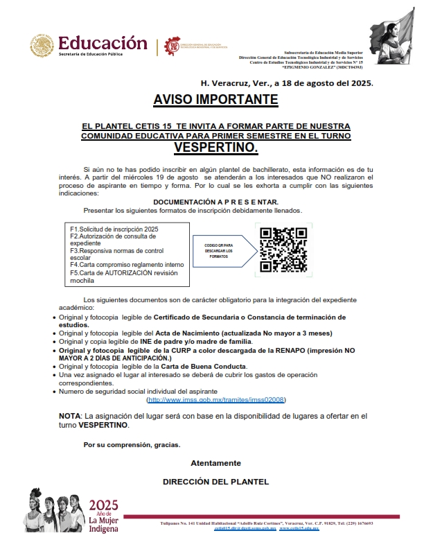 Aviso para interesado a inscripción de nuevo ingreso, el plantel C.E.T.i.s 15 oferta de acuerdo a su disponibilidad lugares a primer semestre en el turno vespertino, por lo cual el interesado deberá de cumplir con los requisitos marcados en el presente aviso.