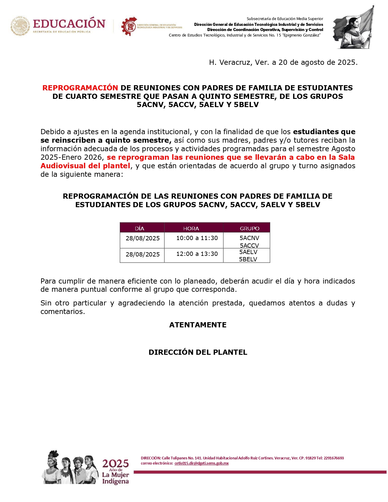 REPROGRAMACIÓN DE REUNIONES CON PADRES DE FAMILIA DE ESTUDIANTES DE CUARTO SEMESTRE QUE PASAN A QUINTO SEMESTRE, DE LOS GRUPOS 5ACNV, 5ACCV, 5AELV Y 5BELV